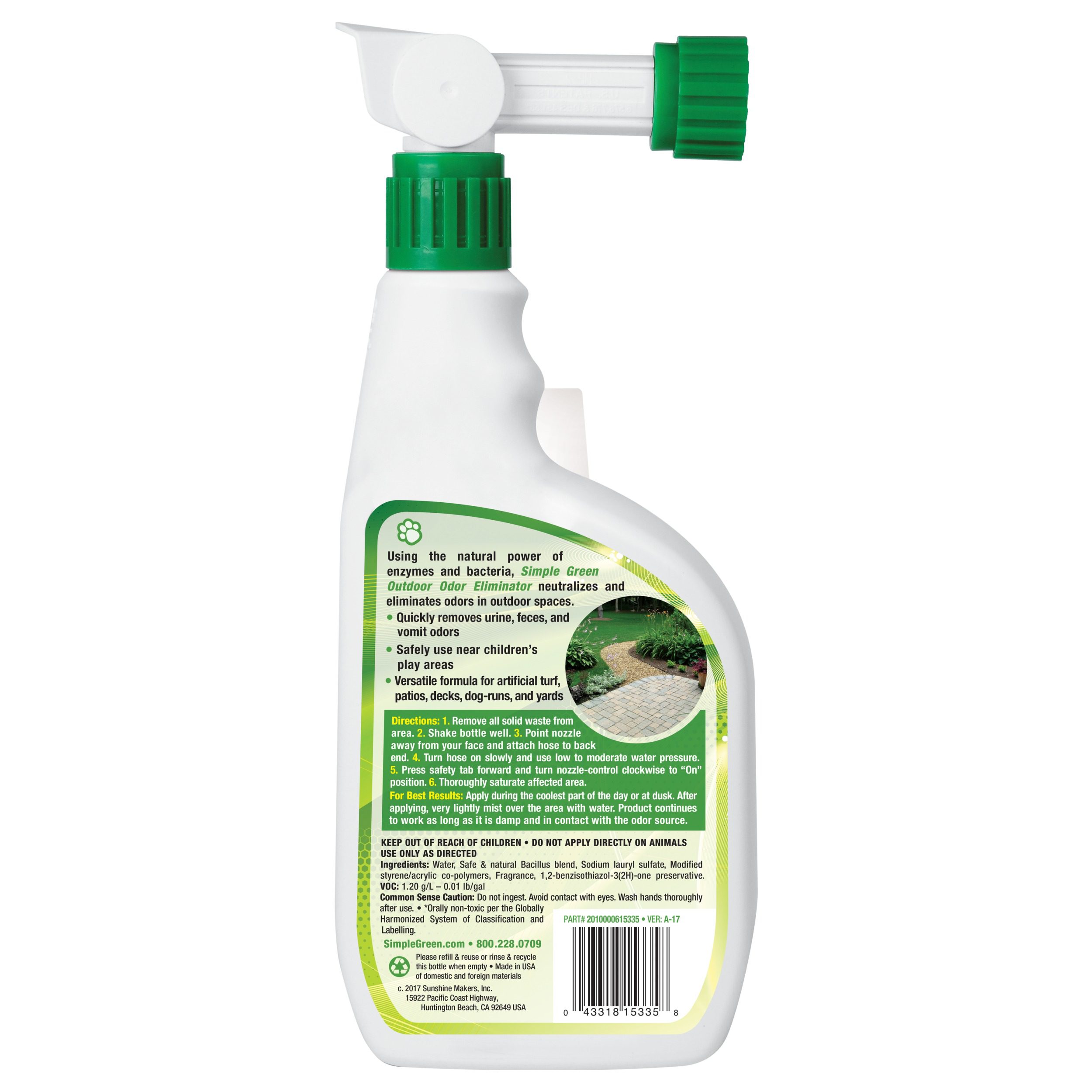 La fórmula lista para usar de Simple Green eliminador de olores para exteriores utiliza potentes enzimas naturales que neutralizan los olores producidos por las mascotas, dejando un fresco aroma a limpio.