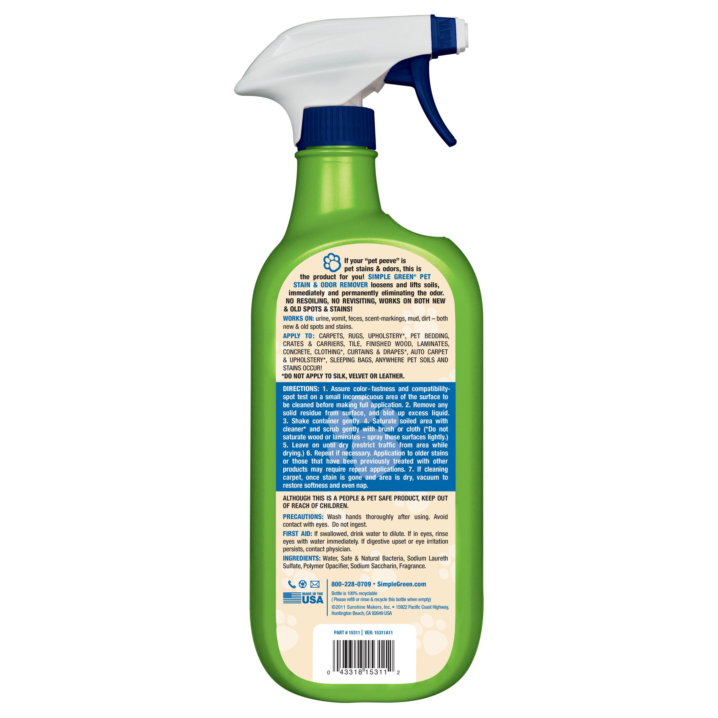Simple Green® Cat Stain & Odor Remover elimina permanentemente las manchas difíciles y los olores desagradables de la orina, las heces, el vómito, las marcas de olor, la suciedad, la sangre y más del gato. Úselo en superficies duras y blandas, como alfombras, tapetes, ropa de cama para mascotas, tapicería, ropa, cortinas, tapicería de automóviles, cajas de arena, jaulas y transportadores, baldosas, madera terminada, laminados, concreto y más. Esta fórmula contiene bacterias seguras que penetran en las superficies para descomponer y digerir la suciedad. Simple Green® Cat se puede usar como limpiador de manchas, en máquinas de limpieza de alfombras y como pretratamiento de lavandería en manchas nuevas, viejas y adheridas. El eliminador de manchas y olores desalienta la nueva visita y el volver a marcar territorio y deja un aroma agradable y fresco.